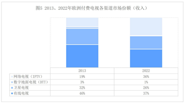 欧洲电视市场分为公共部门和私营部门,其中,公共部门主要通过数字地面电视网(DTT)提供电视频道服务,私营部门主要通过有线电视网、IPTV和卫星电视网提供电视频道服务。