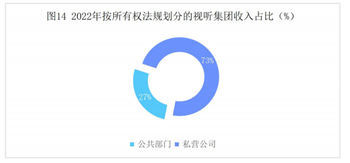 头部的视听传媒集团表现出更强的市场适应能力和发展活力。2022年,欧洲排名前100的视听传媒集团累计营收增速是整个欧洲视听服务市场收入增速的2倍,比2016年增长23%。在排名前100的视听传媒机构中,90%的增长来自私营部门,几乎全部集中在排名前20的私营传媒机构。