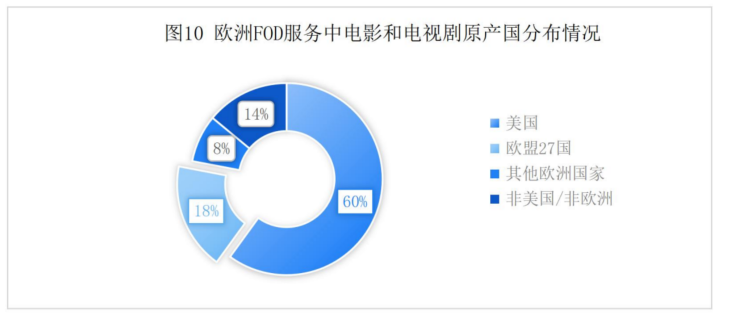在欧盟27国电影和电视VOD节目库中,大多数节目都是非本国的。其中,SVOD非本国节目占比最高,为78%;FOD非本国节目占比67%,TVOD非本国节目占比64%。法国、德国、西班牙和意大利等电视节目生产大国,国产节目份额较高;在节目产量较低的国家,其节目主要来自欧盟其他国家。