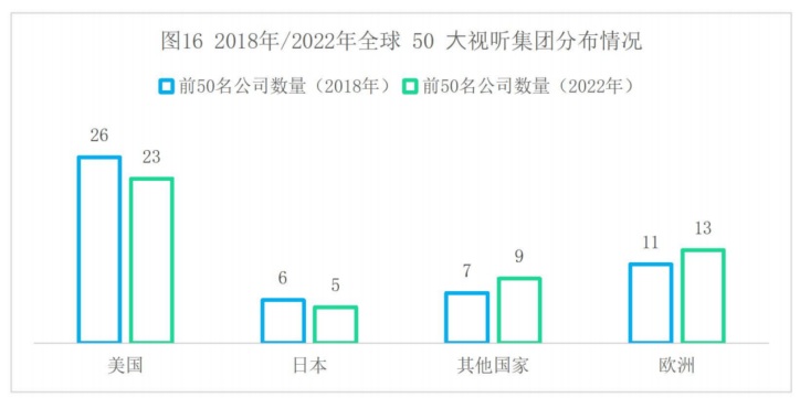 2018年,美国有26家公司跻身全球前50大视听集团,占前50大视听传媒集团总收入的67%;2022年,美国有23家公司跻身全球前50大视听集团,减少了3家,但其收入份额上升到72%。欧洲进入前50大集团的数量从2018年的11家增长到2022年的13家,但其收入份额从2018年的14%下降到2022年的9%。形成这一现象的主要原因是,美国华特迪士尼公司收购了二十世纪福克斯的大部分资产,康卡斯特收购了英国、德国和意大利付费电视服务提供商天空电视台,成为全球最大的传媒集团,欧洲则失去了对头部传媒集团的所有权。