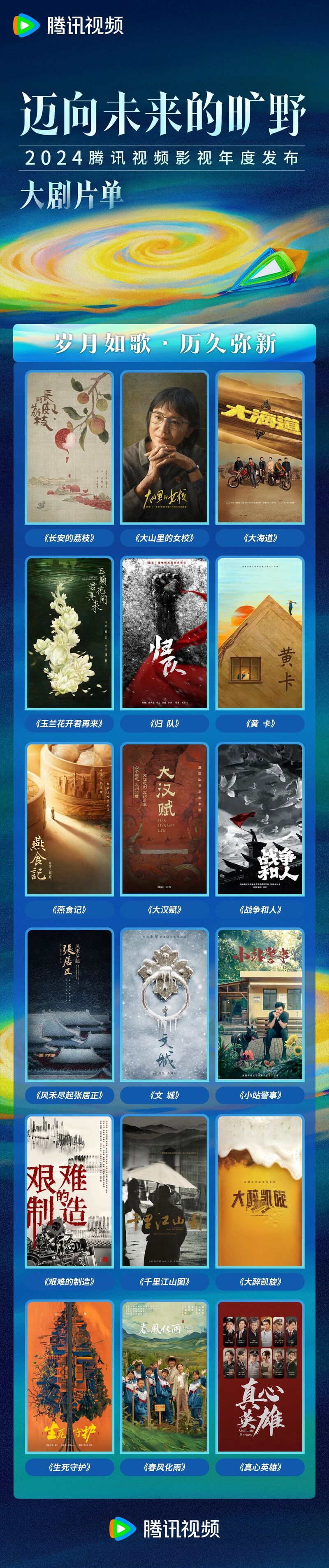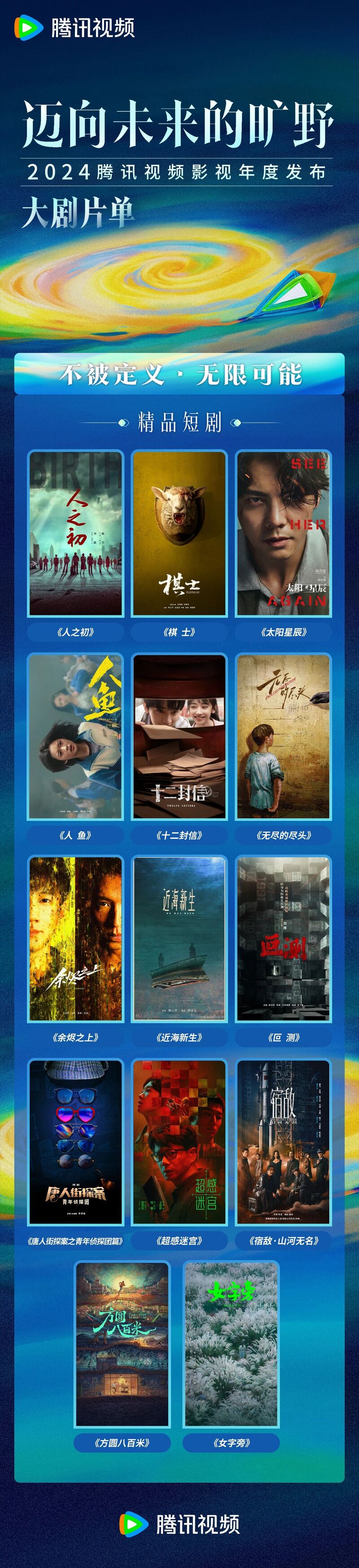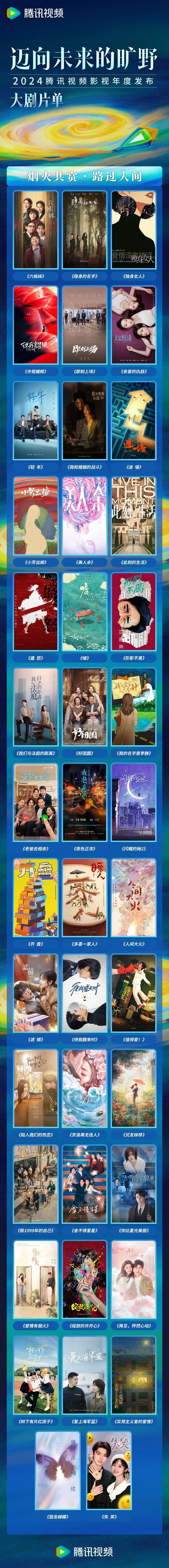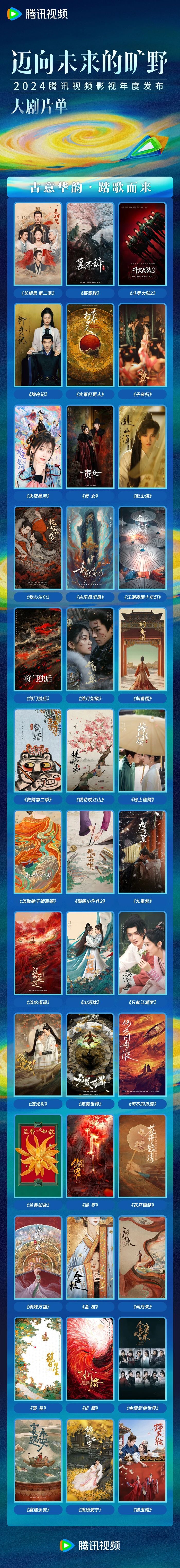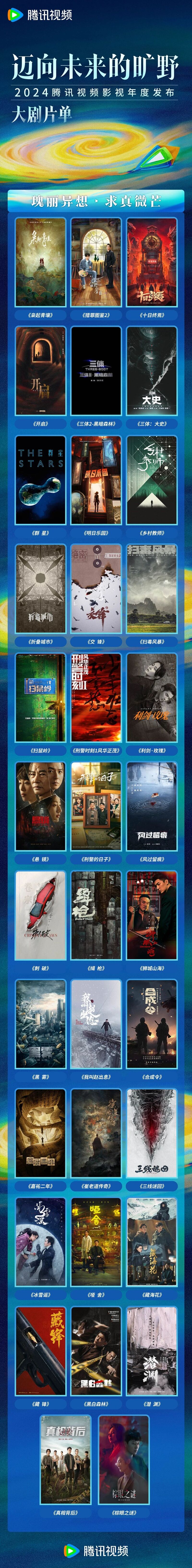 此外,在本次大会上,腾讯视频还发布了五大板块百余部精品剧集内容,涵盖年代文学、都市生活、现实议题、悬疑刑侦、古装武侠、精品短剧、系列喜剧等多元题材类型,持续满足不同用户的观剧需求,展现出内容的更多可能性。未来,腾讯视频将继续以内容为基石,持续升级内容体系,发挥行业领航作用,为推动好内容的制作和传播不断助力,同时,腾讯视频也会继续以开放包容的心态与众多伙伴合作共担、共创共赢,一同打磨优质作品,携手迈向未来的旷野。