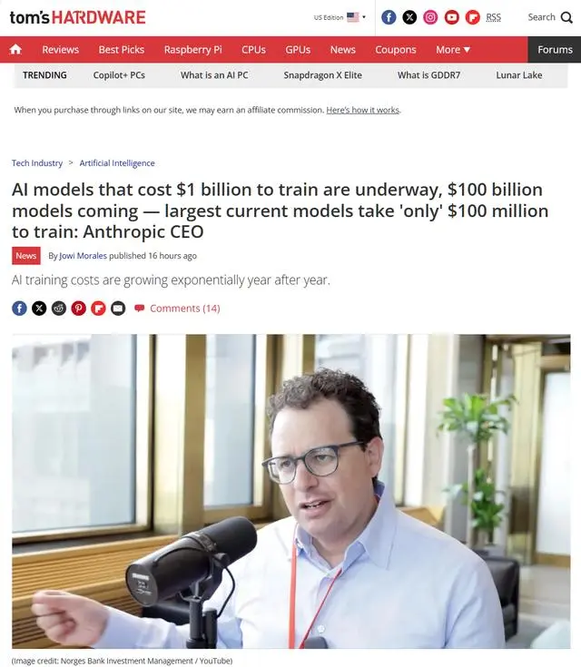 据 Tom's Hardware 7月8日报道,AI 初创公司 Anthropic 的首席执行官 Dario Amodei 近期接受播客节目采访时表示,目前像 GPT-4o 这样的模型训练成本约为 1 亿美元,而目前正在开发的 AI 大模型训练成本可能高达 10 亿美元(IT之家备注:当前约 72.94 亿元人民币)。