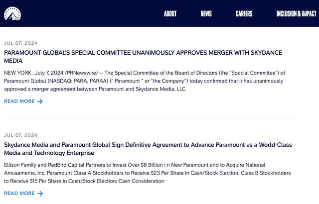 派拉蒙环球公司(Paramount Global)上周日官宣与 David Ellison(甲骨文创始人之子)的 Skydance Media 合并,该交易已获得派拉蒙全球特别委员会一致批准。