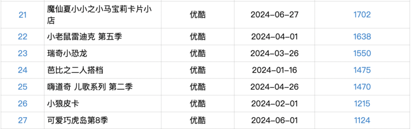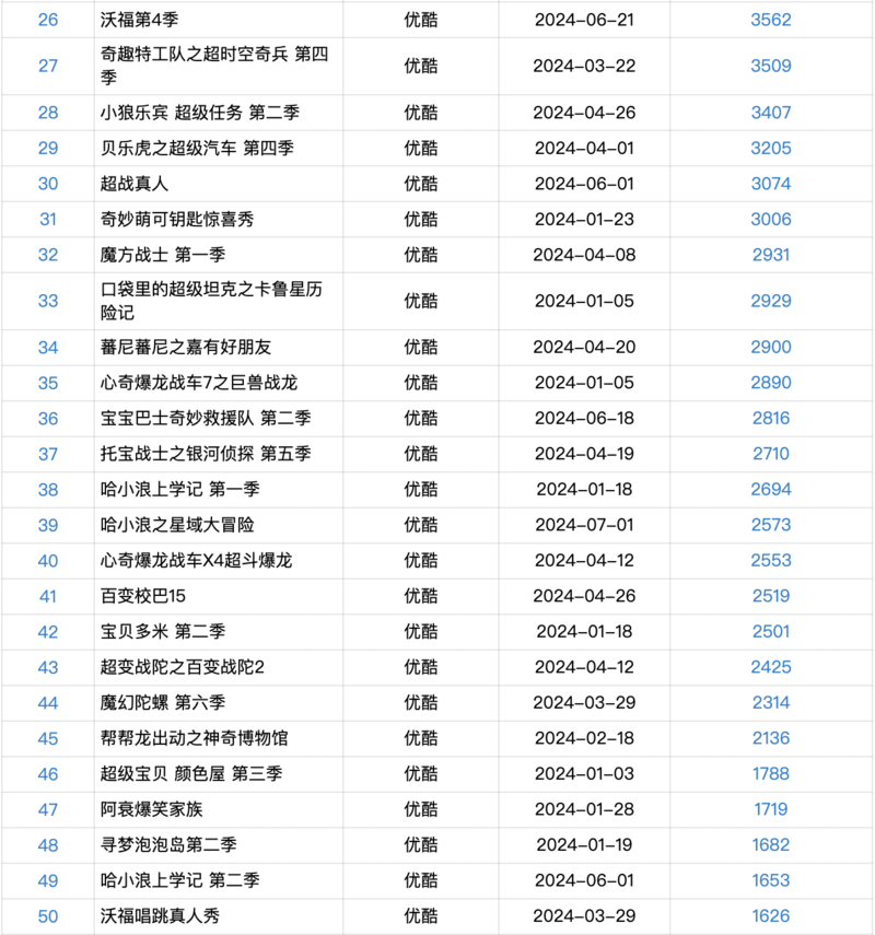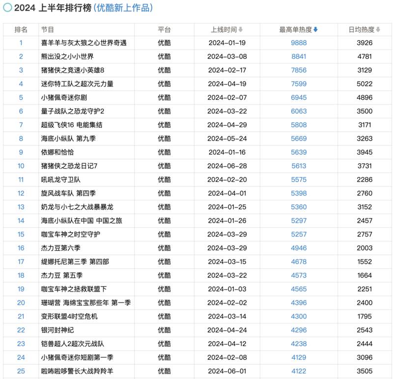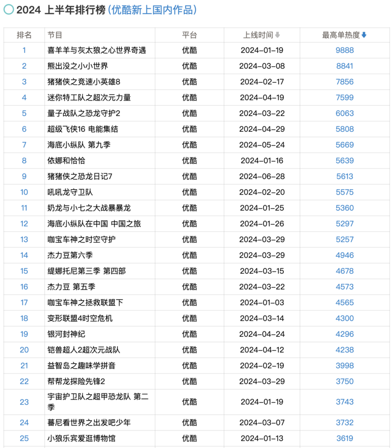 2024年上半年各大视频平台上线上百部部少儿新作,我们来看一下优酷上半年的新作表现如何。