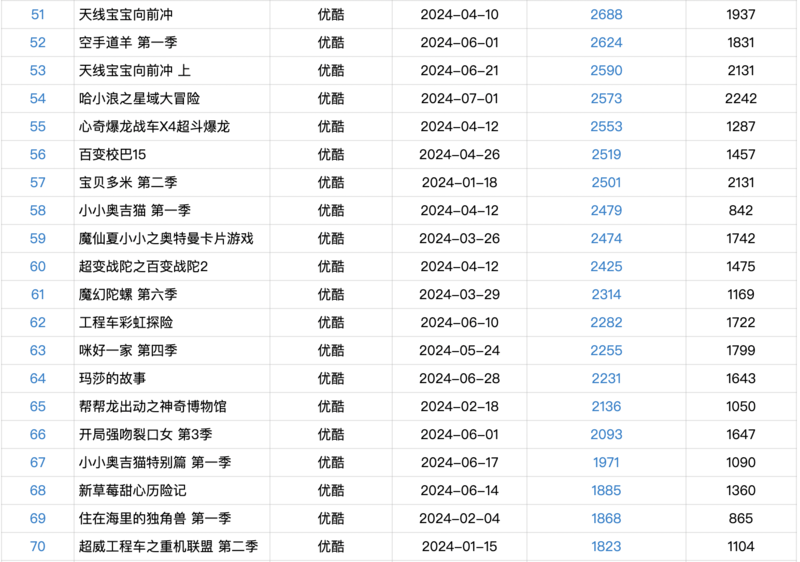 下面排行将优酷2024上半年国内+国外新上少儿作品列出,列出优酷最高热度排名的Top70