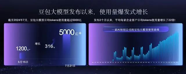 7月25日,火山引擎在成都的2024“AI创新巡展”首站活动中透露了字节豆包大模型的最新进展。截至7月,豆包大模型日均Tokens使用量突破5000亿,比5月15日模型发布时增长了22倍,展示了其在市场上的强劲表现和广泛应用。