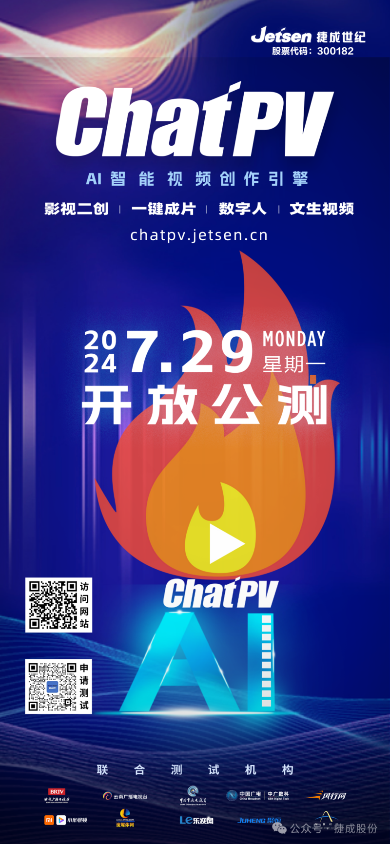 捷成股份自主研发的AI智能创作引擎ChatPV,7月29日将正式上线开放公测。此次开放公测的是ChatPV在线云服务版本的创作者工具,提供影视二创、一键成片、数字人、文生视频等AI智能视频创作生成。ChatPV现可通过https://chatpv.jetsen.cn/在线访问,公测阶段可凭借官方发放的邀请码注册申请试用,或扫描下方二维码申请参与公测。