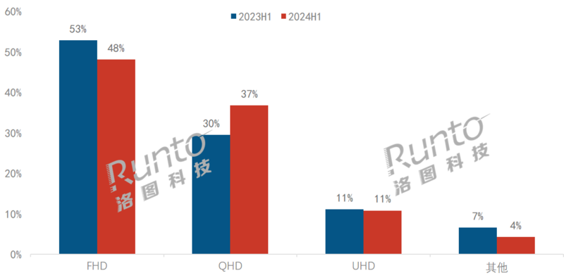 分辨率方面,2024年上半年,尽管主流分辨率FHD产品仍占据市场近五成的份额,达到48%,但相较于去年同期却出现了5个百分点的下滑。