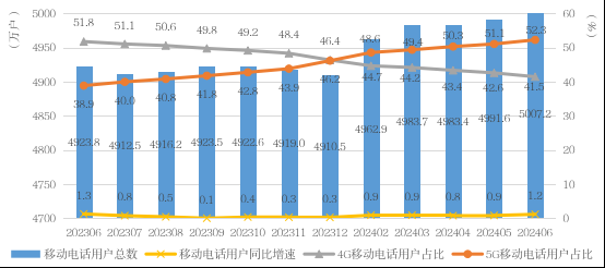 移动电话用户规模突破5000万,5G用户渗透率持续提升。截至6月底,全省电话用户达5664.2万户,同比增长0.7%,其中固定电话用户657万户,同比下降2.1%;移动电话用户5007.2万户,同比增长1.1%。4G移动电话用户达2079.9万户,占移动电话用户总数的41.5%;5G移动电话用户达2618.2万户,同比增长34.8%,占移动电话用户总数的52.3%。