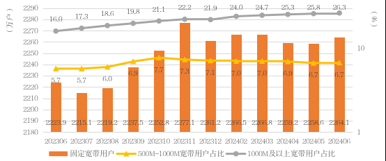 千兆宽带用户保持高速增长。截至6月底,全省(固定)互联网宽带接入用户达2264.1万户,同比增长1.8%。其中,接入速率在500M和1000M之间的宽带用户151.9万户,同比增长20.7%,占总用户数的6.7%;接入速率在1000M及以上的宽带用户595.4万户,同比增长66.8%,占总用户数的26.3%。