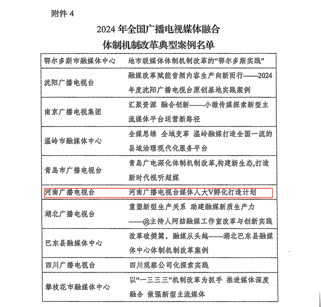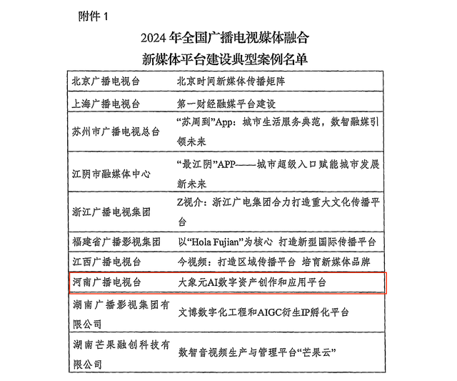 国家广电总局公布全国广播电视媒体融合典型案例,共推选出全国广播电视媒体融合新媒体平台建设典型案例10个、融合生产传播典型案例10个、综合信息服务典型案例10个、体制机制改革典型案例10个。其中河南广播电视台《大象元AI数字资产创作和应用平台》入选2024年全国广播电视媒体融合新媒体平台建设典型案例名单,《河南广播电视台媒体人大V孵化打造计划》入选2024年全国广播电视媒体融合体制机制改革典型案例名单。