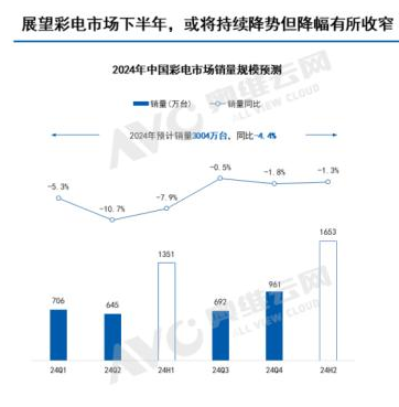 7月25日,奥维云网在发布的2024年上半年电视市场总结中提到,2024上半年中国彩电市场零售量为1351万台,同比下降7.9%。奥维云网还表示,消费者预算缩减导致电视销售不如预期,造成库存水位急剧攀升,这预示着下半年电视出货可能是旺季不旺。其预计,2024年全年中国彩电市场零售量将达到3004万台,同比下降4.4%。奥维云网认为,彩电产品已经基本完成普及,市场历经增量时代、存量时代,目前已经进入到限量时代。