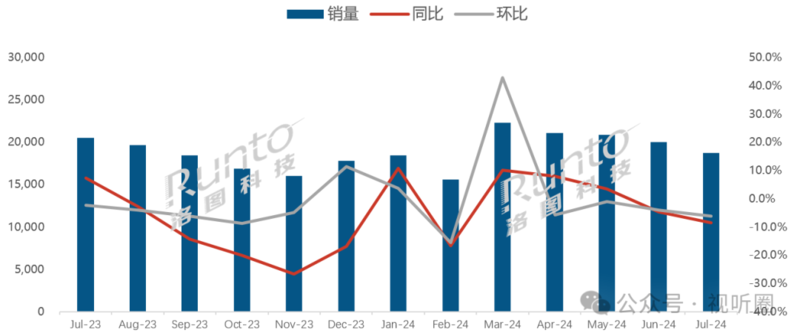 近日,行业机构洛图科技数据显示,2024年7月,全球大尺寸液晶电视面板出货量为18.8M片,同比下降8.5%,环比下降6.2%;出货面积为13.6M平方米,同环比分别下降7.3%和8.7%。当月的平均尺寸为49.3英寸,较2023年同期微增0.2英寸,但环比6月下降了0.7英寸。