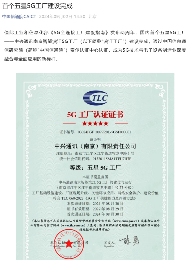 IT之家 9 月 2 日消息,据中国信息通信研究院今日消息,在工业和信息化部《5G 全连接工厂建设指南》发布两周年之际,国内首个五星 5G 工厂 —— 中兴通讯南京智能滨江 5G 工厂建设完成,通过中国信息通信研究院泰尔认证中心认证。