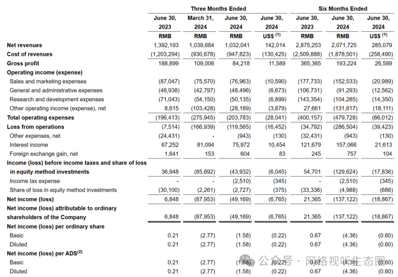 营收成本为9.478亿元(约合1.304亿美元),与2023年同期的12.033亿元相比下滑21.2%。