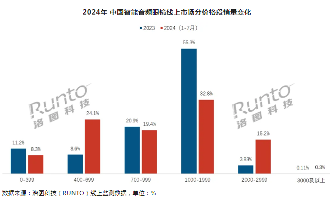 从重量方面来看,以Meta Ray-Ban为例,重量只有49g,而现在大部分的AR眼镜在100g左右;价格来看,AI眼镜更亲民,千元以下价格段的市场占比增长明显,洛图科技数据显示,中国AI眼镜市场中,400-699元价格段占比增长至24.1%,较2023年同期上涨14.7个百分点。