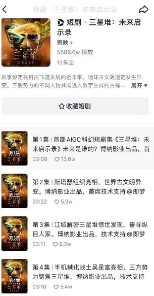 7月8日,博纳影业和抖音合作的AI短剧《三星堆·未来启示录》上线。据悉《三星堆·未来启示录》主要利用AIGC技术完成,其中涵盖了从剧本创作、概念设计、分镜设计到图像视频转换、视频编辑等多种AIGC技术。