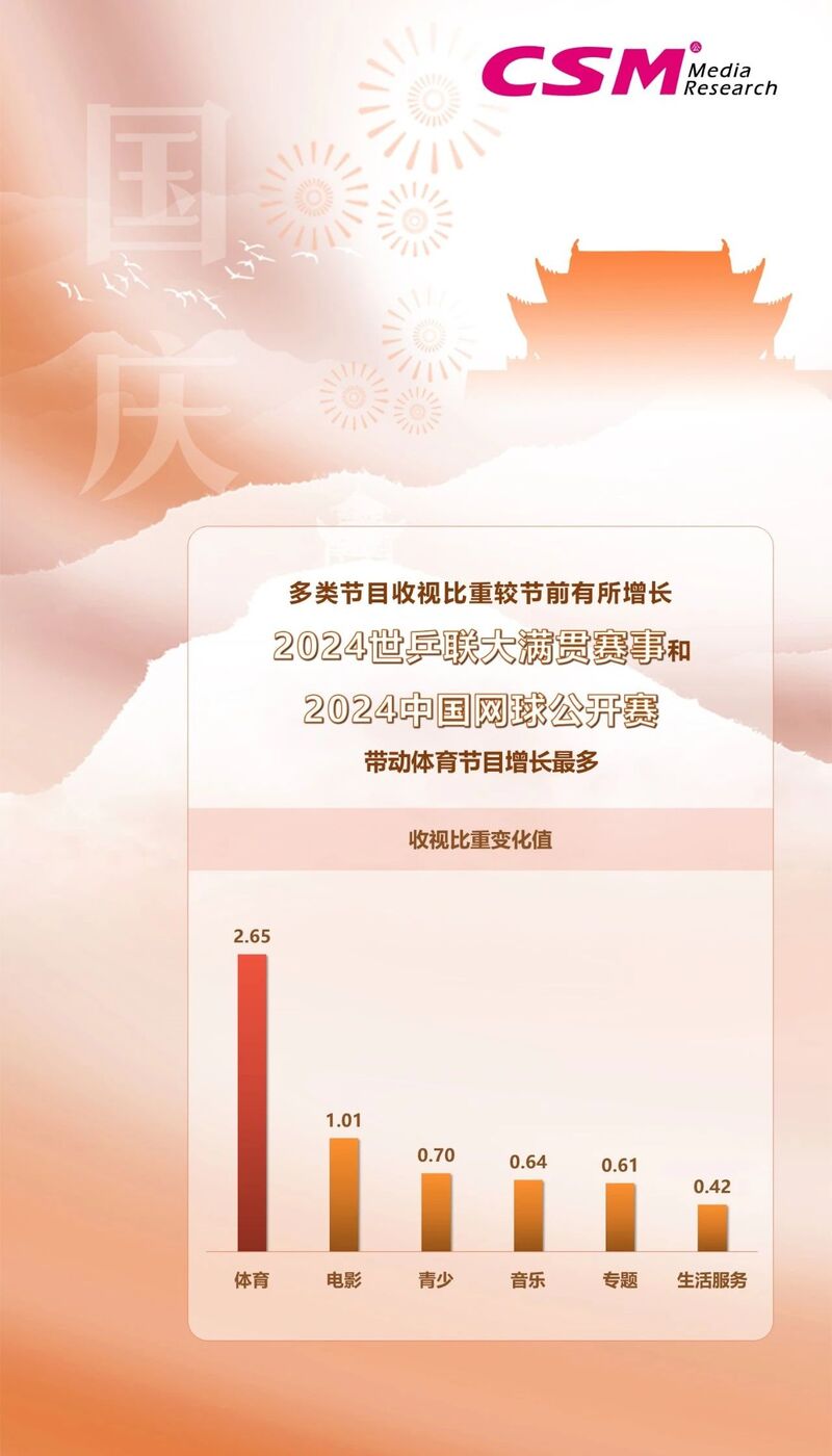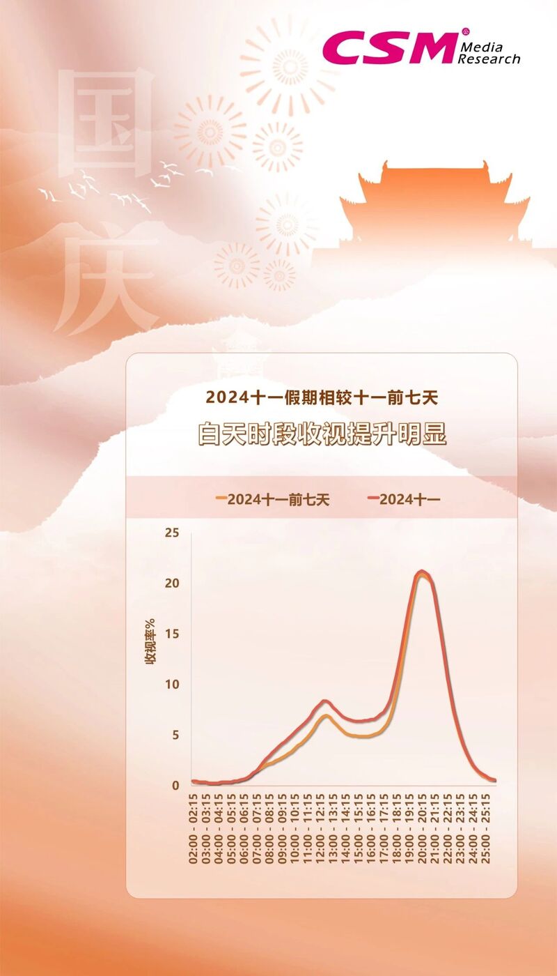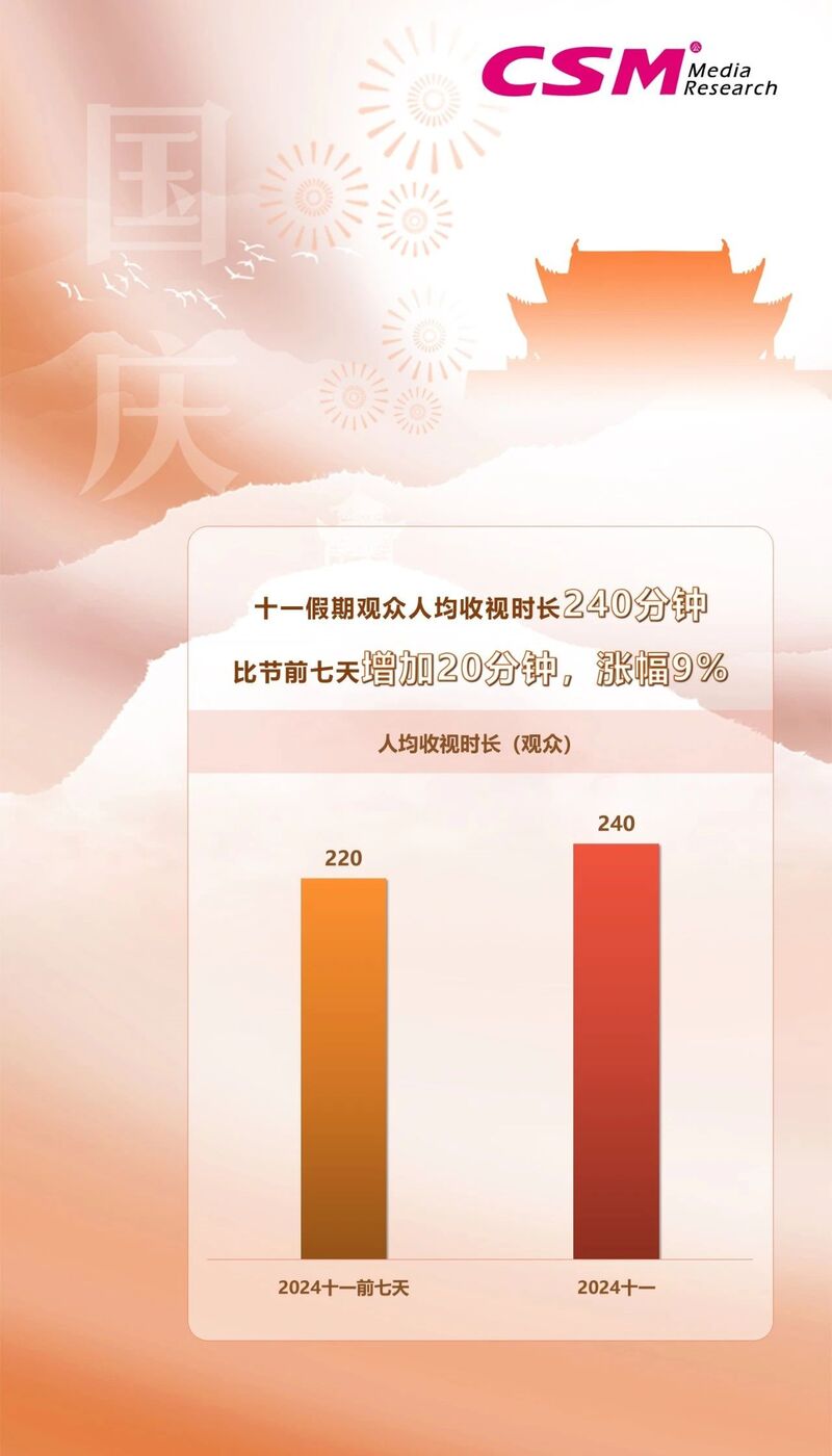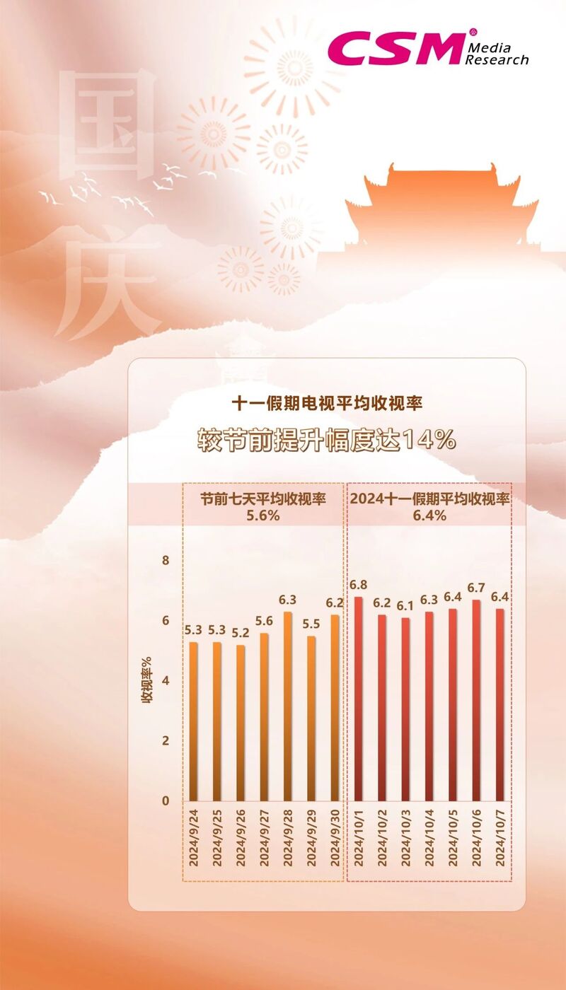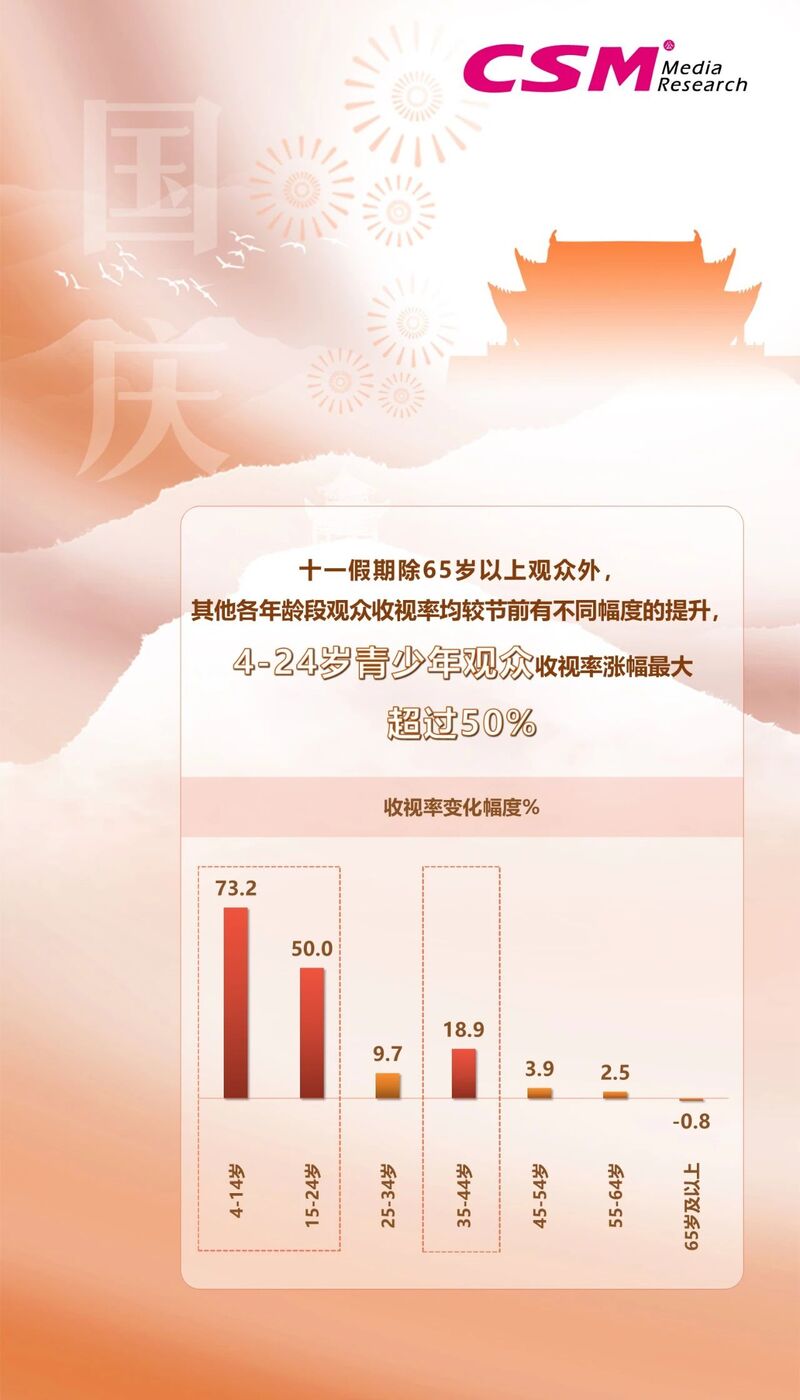 据中国广视索福瑞媒介研究(CSM)数据显示,在十一黄金周期间,电视大屏端的平均收视率相比节前显著提升了14%,人均收视时长达到了4小时。白天时段的收视率提升尤为明显,而晚间黄金时段的各类精彩纷呈的节目更是牢牢锁定了观众的眼球。4-14岁年轻观众成为收视率涨幅最大的群体,收视增幅超过50%。