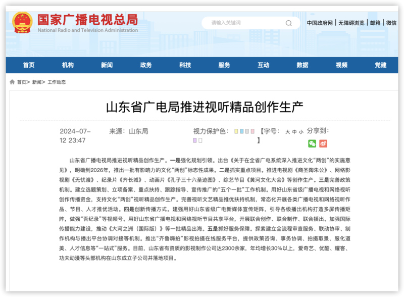 二是抓实重点项目。推进电视剧《商圣陶朱公》、网络影视剧《无忧渡》、纪录片《齐长城》、动画片《孔子三十六圣迹图》、综艺节目《黄河文化大会》等创作生产。