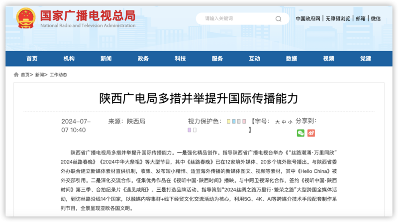 一是强化精品创作。指导陕西省广播电视台举办《“丝路潮涌·万里同欣”2024丝路春晚》《2024中华大祭祖》等大型节目,其中《丝路春晚》已在12家境外媒体、20多个境外账号播出。与陕西省委外办联合建立新媒体素材直供机制,收集、发布短小精悍、适宜海外传播的新媒体图文、视频等素材,其中《Hello China》被外交部引用。