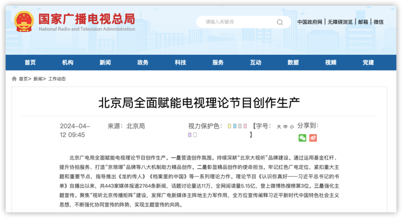 二是彰显精品创作的使命担当。牢记红色广电定位,紧扣重大主题和重要节点,指导推出《龙的传人》《档案里的中国》等一系列理论力作。理论节目《认识你真好——习近平总书记的书单》自播出以来,共443家媒体报道2764条新闻,话题讨论量达11万,全网阅读量5.15亿,登上微博热搜榜第3位。