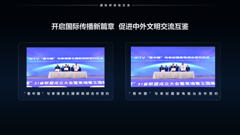 为进一步促进中外文明交流互鉴,在今年9月的IPTV“看中国”31省联盟成立大会上,“看中国”发布了平台新媒体矩阵,并成功与柬埔寨王国新闻部、老挝国家电视台签约达成合作,开启国际传播新篇章。具体怎么做,稍后我们也会有一个“国际传播”主题的分论坛,邀请了四位嘉宾现场做一个分享和探讨,请大家共同期待。