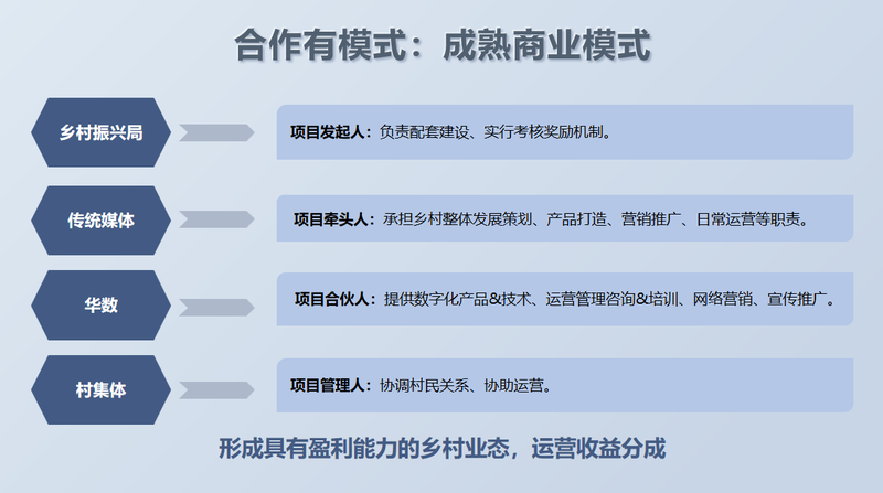 李文敏分享了一个商业模式:项目牵头人是传统媒体,传统媒体有主持人、策划、运营团队,可以帮助乡村进行整体的发展策划、营销推广、内容运营;项目合伙人是华数,提供数字化产品&技术、运营管理咨询&培训、网络营销、宣传推广;村集体负责把农村的生产力调动起来,协调项目的运营。