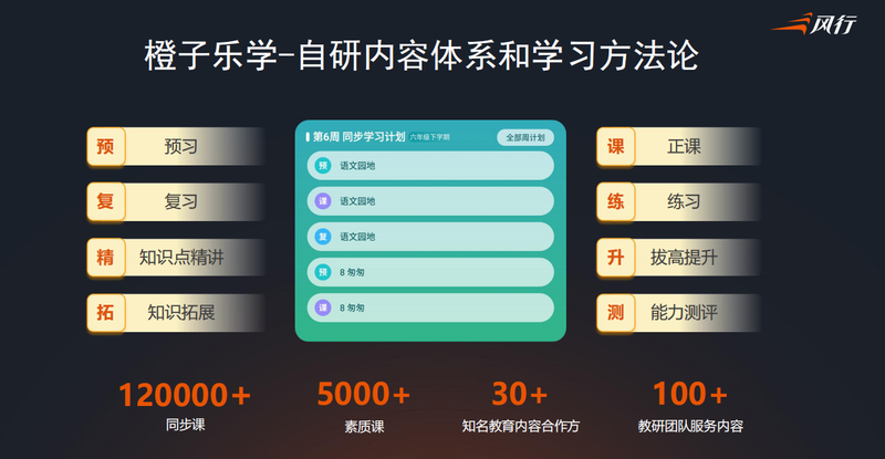 橙子乐学采用了风行自研的内容体系和学习方法论,而且风行组建了自己的教研团队,将全国30多个版本的教材与教育大纲进行同步。据了解,橙子乐学覆盖了预习、正课、复习、练习全学习流程,同时还可以进行知识点精讲、拔高提升、知识拓展、能力评测等。