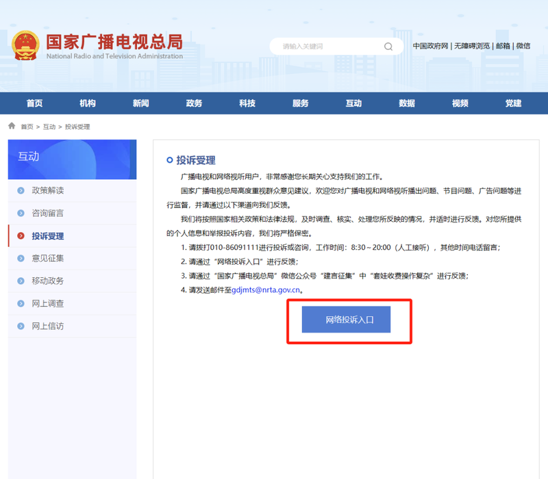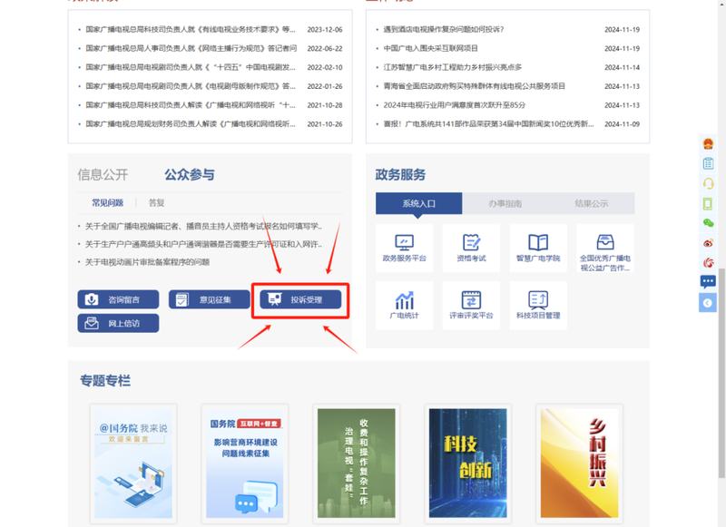登录国家广播电视总局官方网站(www.nrta.gov.cn),首页下滑至底部,选择“公众参与”中的“投诉受理”。