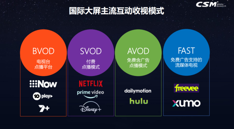 除此之外,这两年比较热门的海外视听新模式——FAST(Free Ad-supported Streaming TV,免费广告支持型流媒体电视),则是一种“免费化电视”的代表。