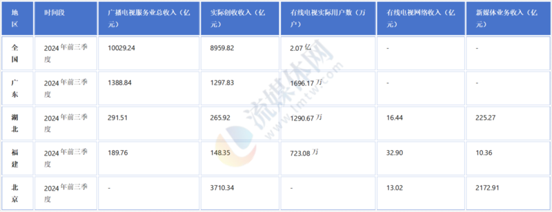 日前,国家广播电视总局发布2024年前三季度全国广播电视服务业相关数据。紧接着,广东、湖北、福建、北京2024年三季度广播电视和网络视听创收收入情况也相继发布,主要数据如下表: