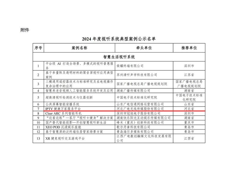 近日,工业和信息化部公布了2024年度视听系统典型案例名单。其中,河北广电无线传媒股份有限公司报送的“IPTV健康万家服务平台”入选智慧生活视听系统方向典型案例。