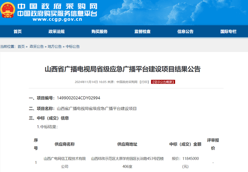 流媒体网也查阅到近期一些具体中标案例,仅11月就有不少项目动态,如,山西省广播电视局省级应急广播平台、通城县/江陵县应急广播体系建设项目、临西县应急广播体系建设项目(二标段)都由当地广电网络公司或其控股公司中标。