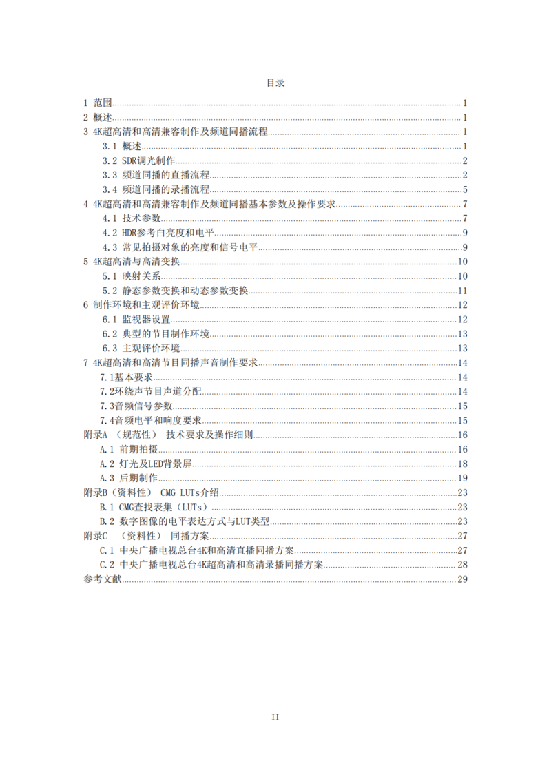 为促进和规范4K超高清和高清同播频道建设,切实保障4K超高清和高清节目兼容制作技术质量,国家广播电视总局科技司于2024年设立了“4K超高清和高清兼容制作及频道同播实施指南”项目,由中央广播电视总台牵头成立了实施指南起草小组。起草小组基于4K超高清电视技术特点及国内外HDR与SDR兼容制作研究成果,结合中央广播电视总台4K超高清节目制播实践经验,围绕4K超高清和高清兼容制作及频道同播的工作流程、技术要求、系统配置等开展专题研究和测试。考虑到4K超高清及其下变换的高清都将进行播出、传送或交换,为兼顾二者的高质量,对4K超高清和高清兼容制作流程和基本参数及上下变换要求、制作环境和主观评价环境要求、声音制作要求等提出了指导意见,并以中央广播电视总台转换查找表集(CMG LUTs)和频道同播方案为例,给出了参考实现方案,形成了本实施指南(2024版)。