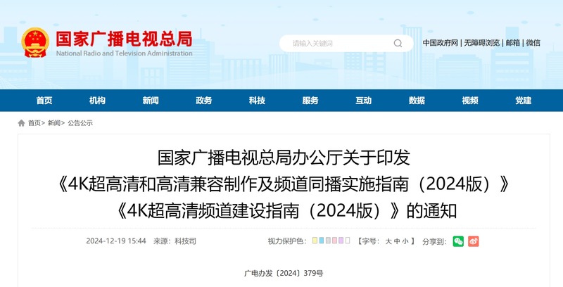 为推进超高清高质量发展,指导4K超高清频道高水平建设,切实保障高清超高清同播频道技术质量,提升4K超高清节目制播能力,促进4K超高清制播域优化升级、提质增效、创新发展,国家广播电视总局组织编制了《4K超高清频道建设指南(2024版)》《4K超高清和高清兼容制作及频道同播实施指南(2024版)》,于近日发布。