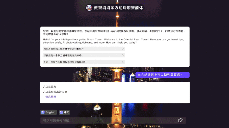 “数智塔塔·东方明珠塔智能体”还拥有中英一键切换功能,为国内外游客提供更加便捷的智能导览和互动体验。