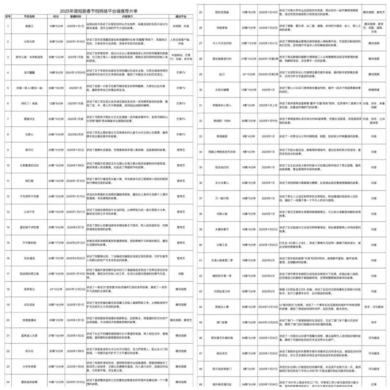 时间播回当下,国家广播电视总局在近日发布了「微短剧陪你过大年」2025年微短剧春节档推荐片单,抖、快以及爱优腾芒的多部独播作品皆在其中。