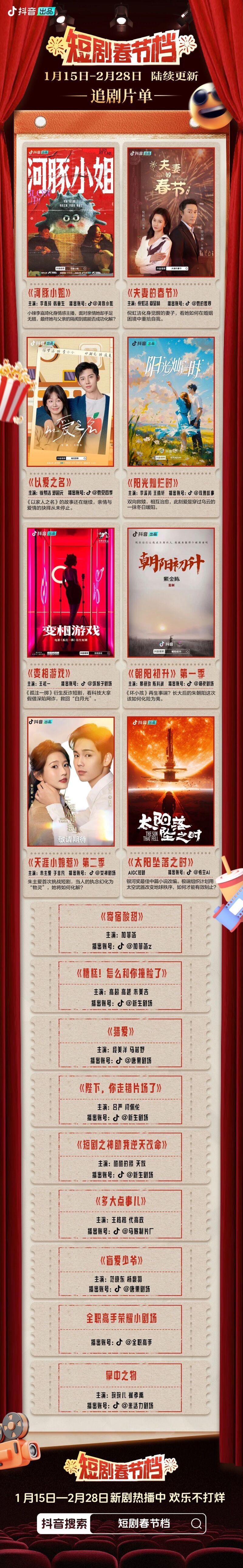 2025年短剧春节档,由抖音出品的《河豚小姐》《夫妻的春节》《阳光灿烂时》《以爱之名》《朝阳初升》等30部精品短剧将轮番上线。抖音与东方卫视合作推出的“喜剧春晚”《欢剧喜乐会》也计划于大年初五,通过抖音、东方卫视大屏同步播出。