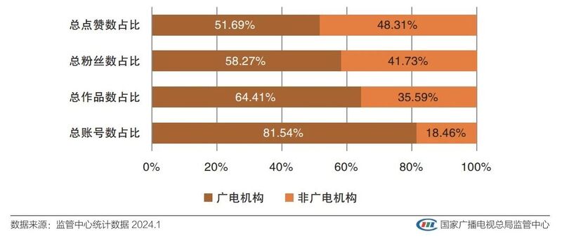 广电主力军集结发光,主流思想舆论巩固壮大。2023年以来,主流媒体全面深入挺进主阵地主战场最前沿的步伐愈发坚实、铿锵有力。特别是以全国广电新媒体联盟为龙头的广电主力军大力开展网上宣传,党的宣传舆论阵地不断壮大,传播力影响力持续提升。数据显示,截至2023年底,在抖音、快手、微信视频号三大主流短视频平台上,42家广电媒体机构总账号数5405个、总粉丝数380.81亿、总点赞数12244.9亿、总作品数875.3万条,各项数据分别占516家省级及以上主流媒体机构的81.54%、64.41%、58.27%、51.69%。广电主力军以绝对的体量、积极的作为、有效的引领助力网上主流思想舆论不断巩固壮大。