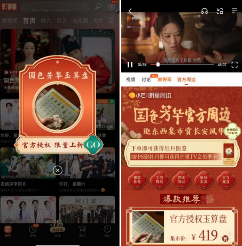 在剧集上线当天,在芒果TV上线各类资源位,周边上新总量超80款。而女主角何惟芳(杨紫饰)的同款「玉算盘」之所以会被打爆,既是它本身颜值高,激发观众对好物本身的喜爱之情;又与剧情联动,激发观众玩梗的热情——「这个世界就是一个巨大的刘家,都在惦记何惟芳的嫁妆」。所以,内容电商的产品研发与其他电商有所差别,需要对内容有精准的理解、对用户需求有敏锐的洞察——要找到内容与需求的最大公约数。