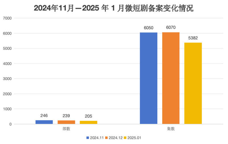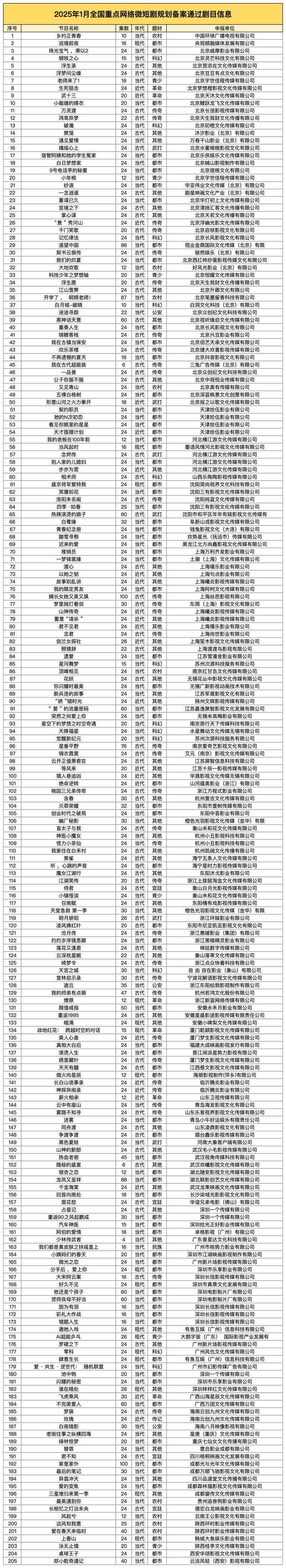 2025年1月,全国重点网络微短剧规划备案公示的网络微短剧共205部、5382集。