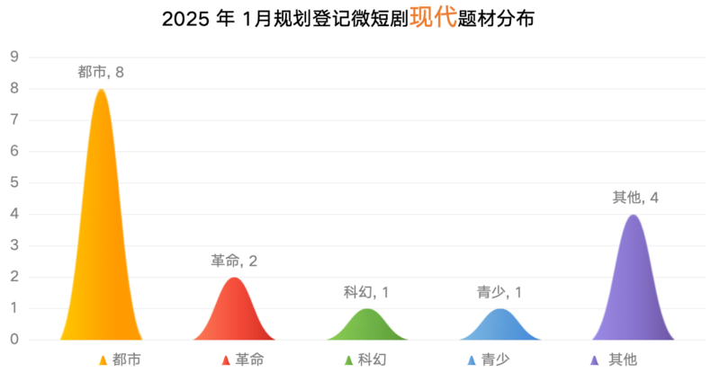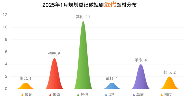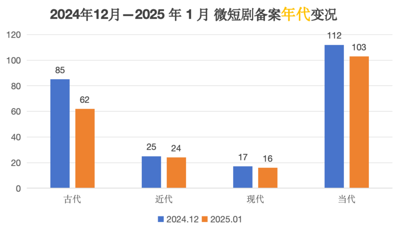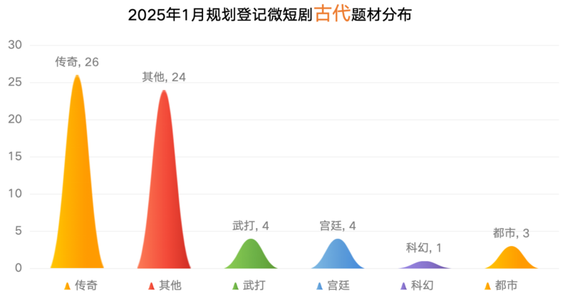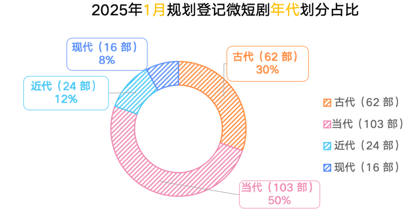 年代分布情况上,2025 年1月各年代备案数量有所回落,其中,古代背景下降明显:2025 年 1 月各年代备案部数普遍下降,其中古代背景下降率最高,环比下降约 27%。当代背景下降率居于其次,环比下降约 8%,比古代题材稍稳定。