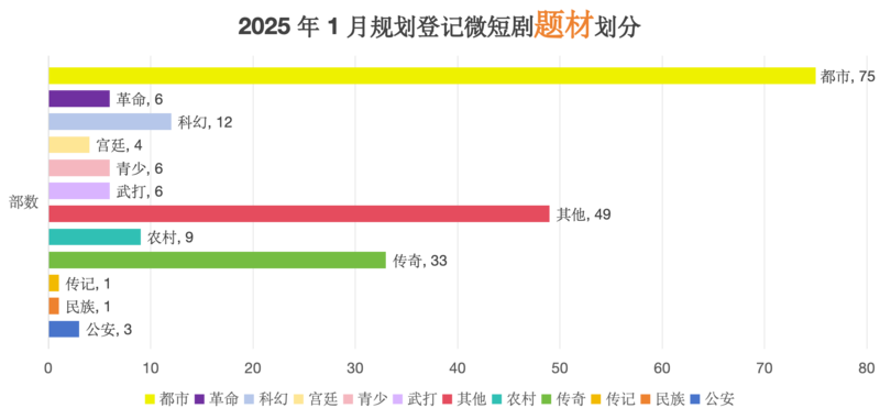 备案部数:2025 年 1 月备案部数为 205 部,2024 年 11 月为 246 部,12 月为 239 部。2025 年 1 月较 2024 年 11 月减少了 41 部,环比下降约 16.7%;较 12 月减少了 34 部,环比下降约 14.2%。