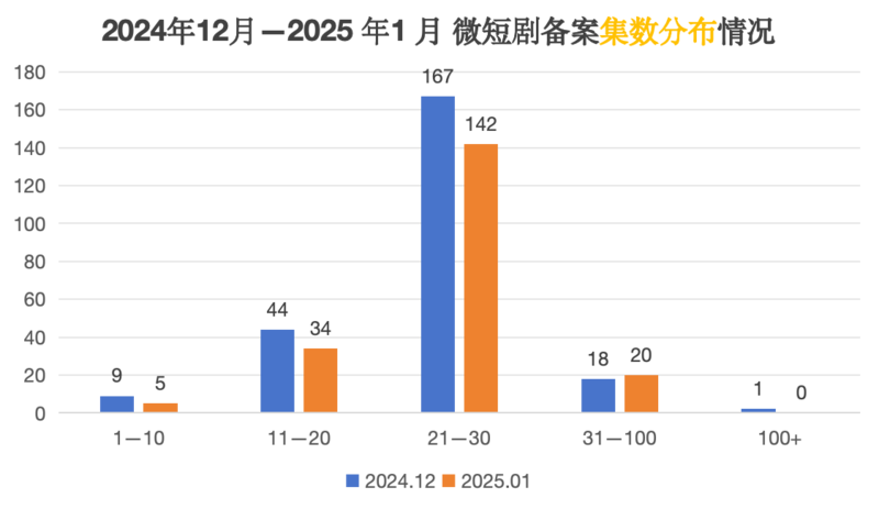 集数分布上,21-30集等中等体量依然是大势,且2025 年 1月24集备案数量达到122部,占比59.5%;整体数量浮动不大。