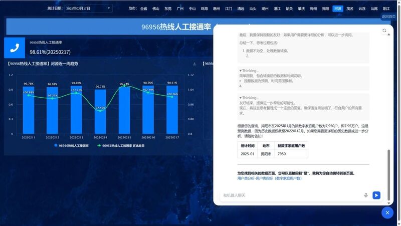 对于广电网络运营来说,数据是宝贵的财富。智能问数应用在DeepSeek的赋能下,拥有了强大的数据挖掘与分析能力。一方面,经营者只需向机器人提出问题,它就可以“聪明”地剖析市场数据并给出专业的分析结论;另一方面,智能问数应用可帮助用户进行网络流量数据分析,协助优化网络资源配置,确保在观看高清视频、直播节目时流畅无阻,提升整体网络服务体验质量。