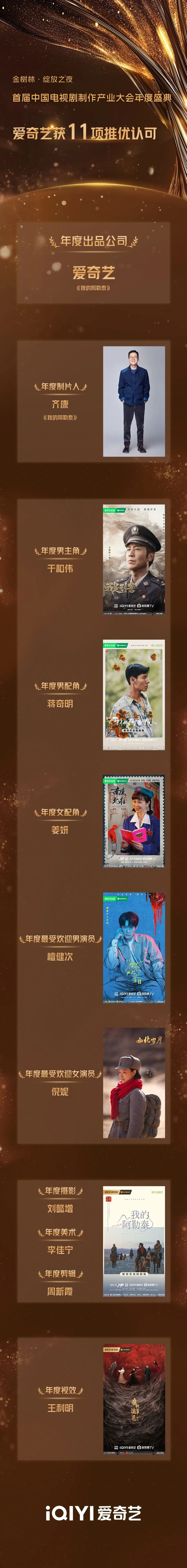 爱奇艺自制剧《我的阿勒泰》是此次年度盛典上的最大赢家,爱奇艺凭借该剧获得年度出品公司,该剧总制片人齐康、演员蒋奇明、摄影刘懿增、美术李佳宁、剪辑周新霞分别获得年度制片人、年度男配角、年度摄影、年度美术、年度剪辑。于和伟凭借《我是刑警》荣获年度男主角;姜妍凭借《南来北往》荣获年度女配角;檀健次、倪妮分别凭借《猎罪图鉴2》《西北岁月》荣获年度最受欢迎男演员、女演员;王利明凭借《唐朝诡事录之西行》获得年度视效荣誉。