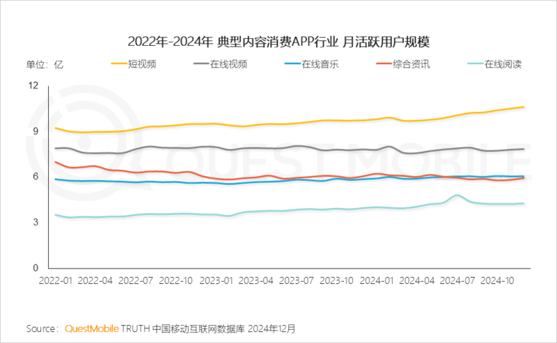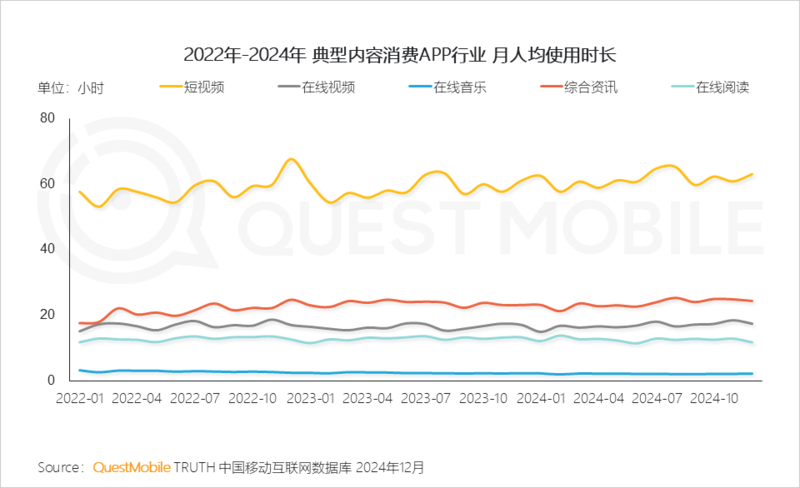 QuestMobile数据显示,从2022年到2024年,典型的内容消费领域如短视频、在线视频、在线音乐等,月活用户规模、月人均使用时长均保持了平稳增长态势,尤其是时长方面,在2024年12月,分别保持在了63小时、17小时、2小时左右。