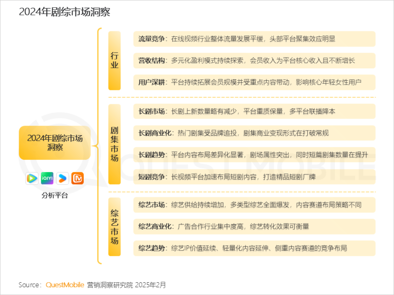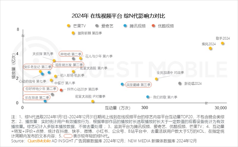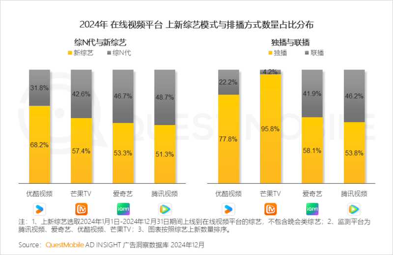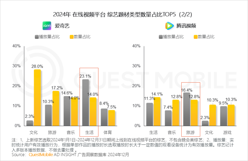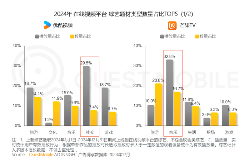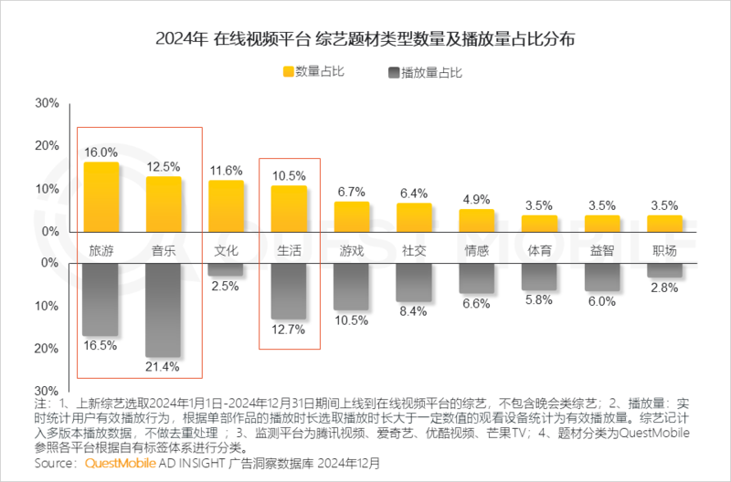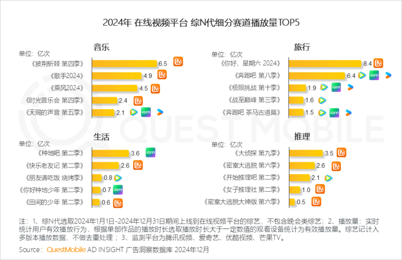 此外,几大平台的综艺赛道竞争也进入“深水区”,旅游、音乐、文化、生活等领域数量占比分别达到16%、12.5%、11.6%、10.5%;具体到各家来看,整个2024年,优酷视频、芒果TV、爱奇艺、腾讯视频分别上新了96部、95部、93部、78部……