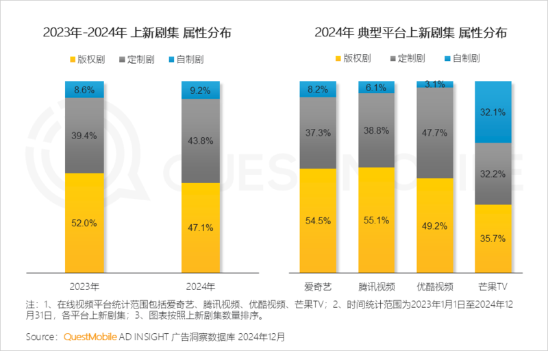 其中爱优腾在自制+定制剧集上新数量占比相近,芒果TV投入最高,超60%。