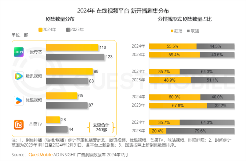 2024年四大视频平台共上新240部剧集,比2023年同比减少10.8%。同时为降低内容成本,多平台联播正在加深。